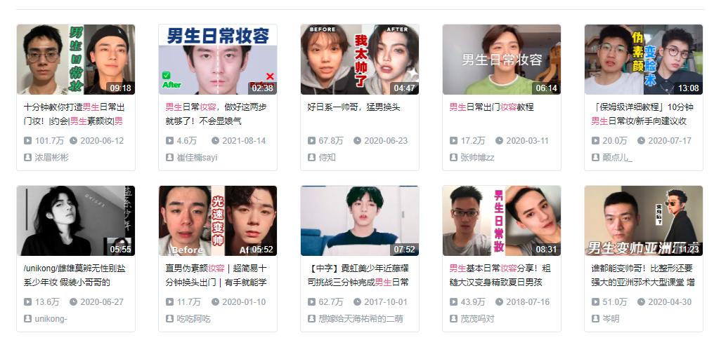 在小红书,搜索“男士护肤”、“男士化妆”、“男士医美”都会出现上万篇笔记分享;B站上,“男生妆容”类视频,最高播放量高达101.7万。