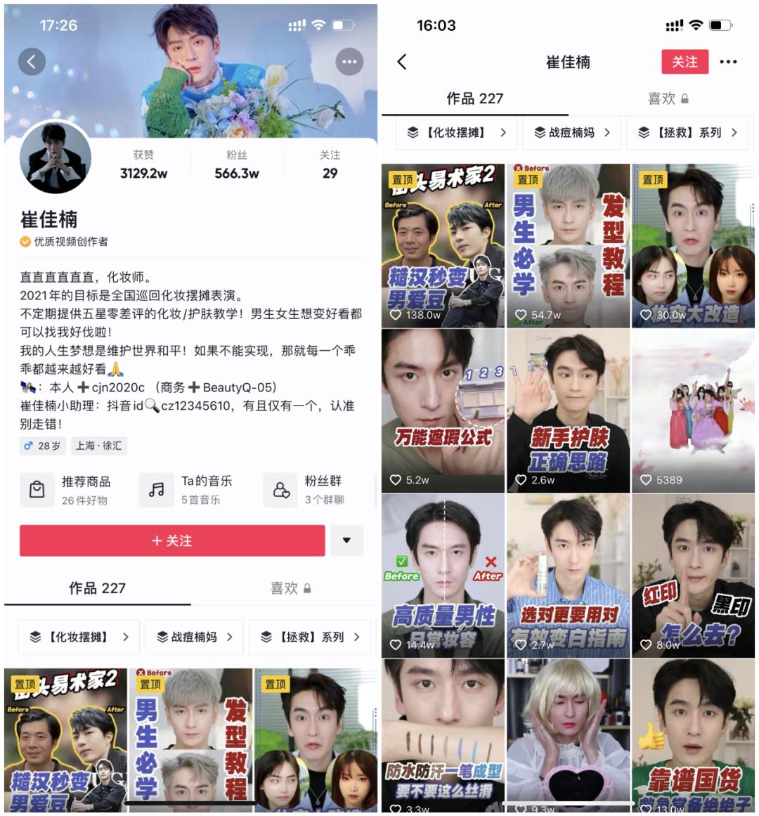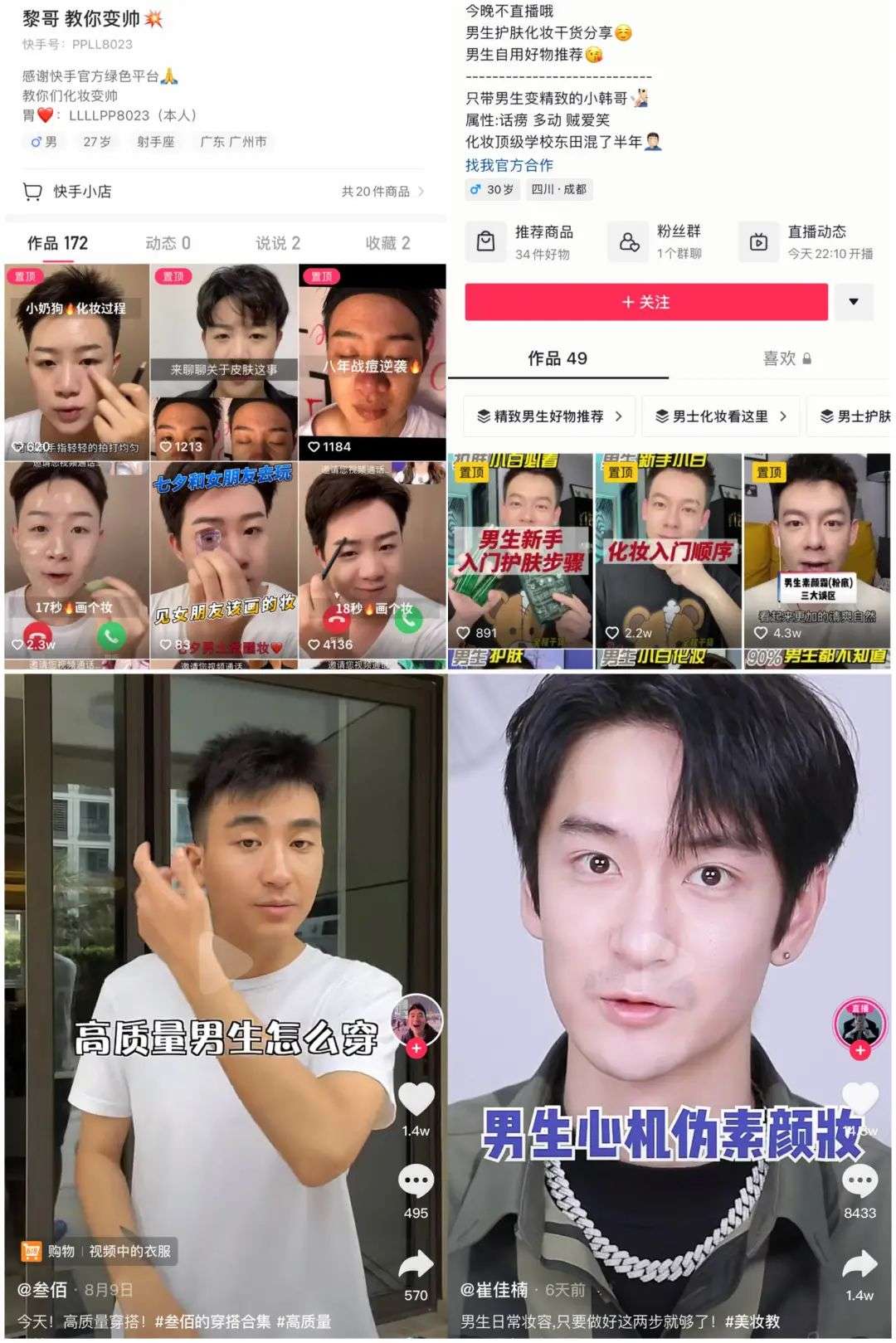 在抖音和快手平台,我们也可以看到越来越多的男性化妆博主,他们主要的受众群体是00后的年轻男生,通过分享化妆技巧、开箱测评、好物盘点,刺激年轻男性的消费欲望。