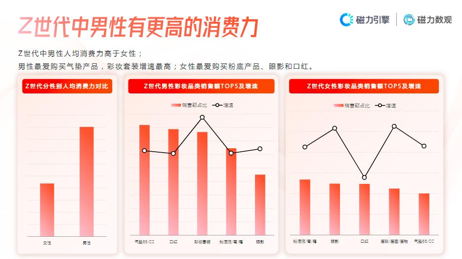 根据《2020年快手彩妆行业数据价值报告》显示,随着偶像经济和审美多元化的发展,Z世代中男性人均消费力均高于女性,越来越多男性开始注重自身颜值的管理,并加入到美妆大军当中。其中,粉底液、定妆喷雾、散粉这些使用起来简单的底妆产品最受男性欢迎,塑造干净清爽的男性形象是这类消费者的普遍追求。