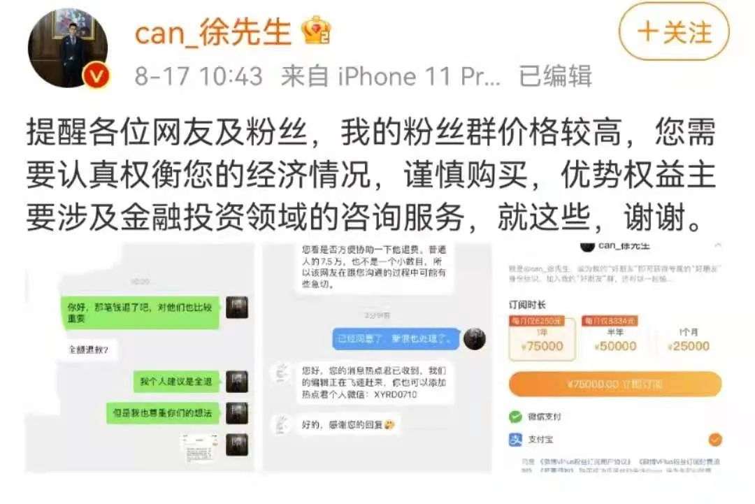 令人更意想不到的是,居然还真有人会付费购买,8月17日早间,徐先生发微博表示,其粉丝群价格较高,请大家谨慎购买,优势权益主要涉及金融投资领域的咨询服务。