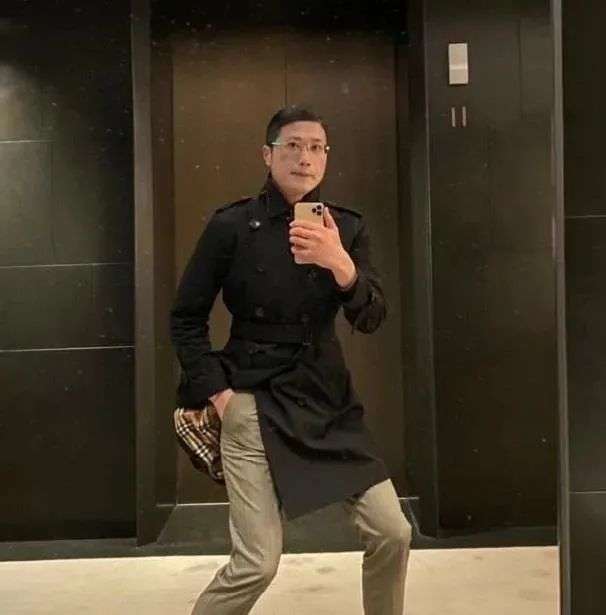 西装、油头、粉面红唇,左手举着手机,右手踹兜,不经意间漏出带有Burberry标志的衣角。