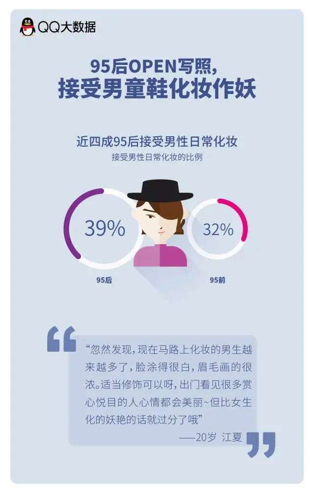 2019年,腾讯曾在发布一篇关于“95后审美观”的报告。报告上显示,近四成95后人群接受男性日常化妆。