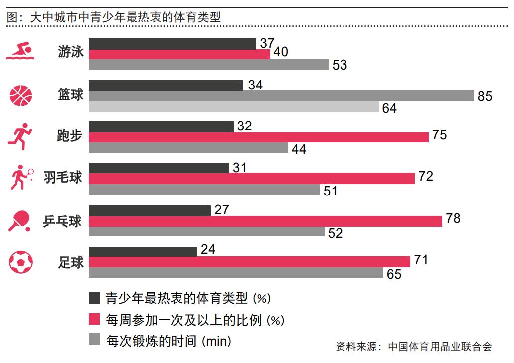 而对于贡献了最多就业岗位的体育培训业,则应该关注青少年的偏好。据这份报告,国内大中城市青少年最热衷的体育项目,游泳、篮球、跑步、羽毛球和乒乓球位列前五。而足球则在参与次数和时间上表现突出。