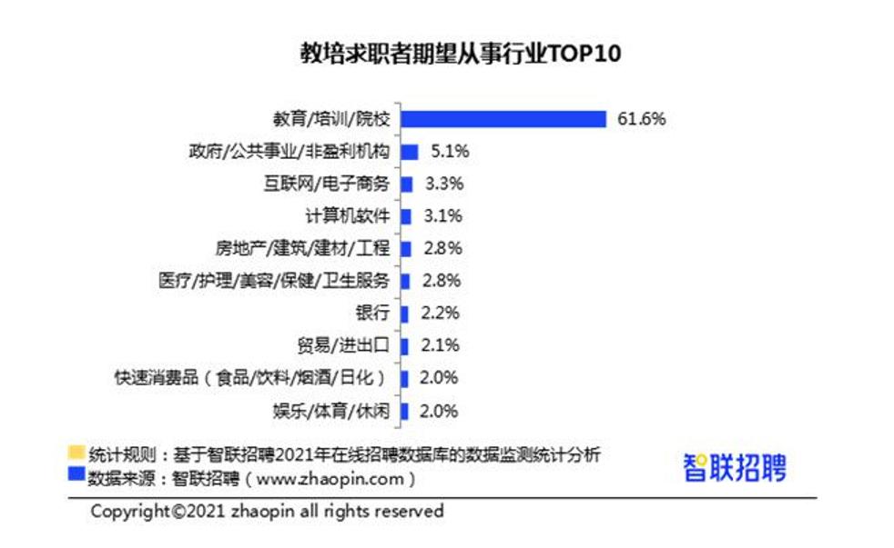 另一则有趣的数据可以反应体育行业在整体求职者心中的地位。智联招聘近日发布《2021教培行业人才市场分析报告》,在原教培行业从业者希望转型的行业中,体育跻身前十名。