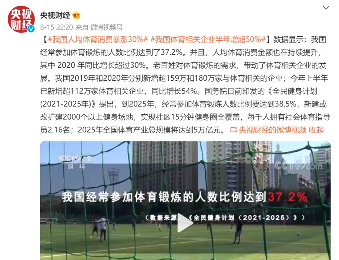 目前,越来越多的人已经习惯于参与运动和健身,经常参与体育锻炼的人数比例达37.2%,体育相关的消费和体育产业规模也自然水涨船高。