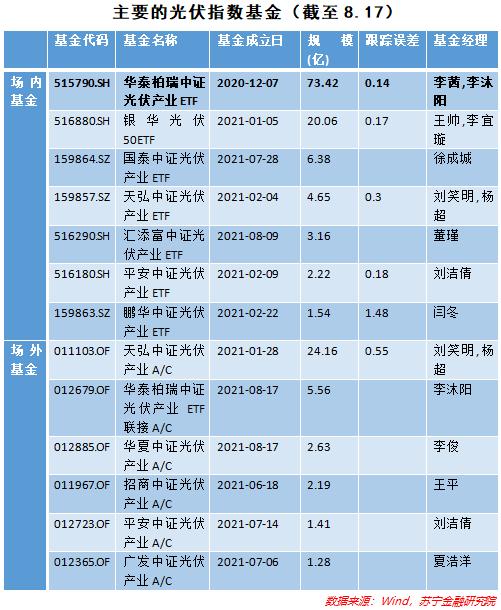 对于场内基金,华泰柏瑞中证光伏产业ETF规模最大,流动性较好,且对于指数的跟踪偏差较小。
