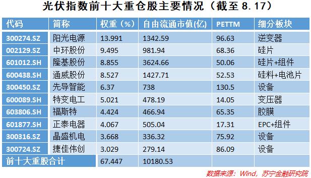 集中度方面,光伏指数前十大重仓股占比为67%,指数的集中度较高,指数的龙头带动效应显著。