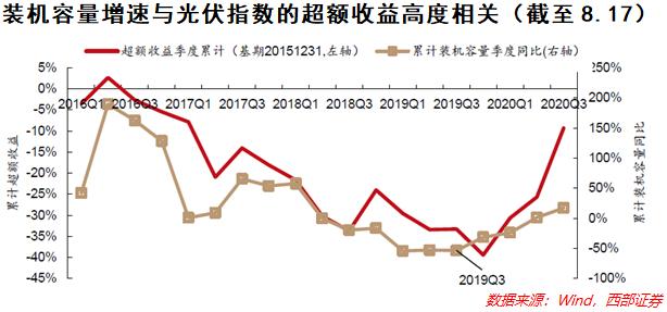 一是光伏的装机量,装机容量增速与光伏指数的超额收益高度相关。