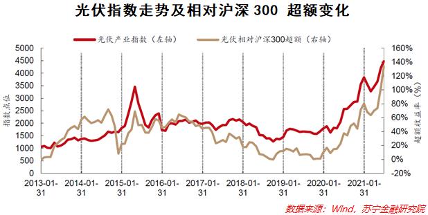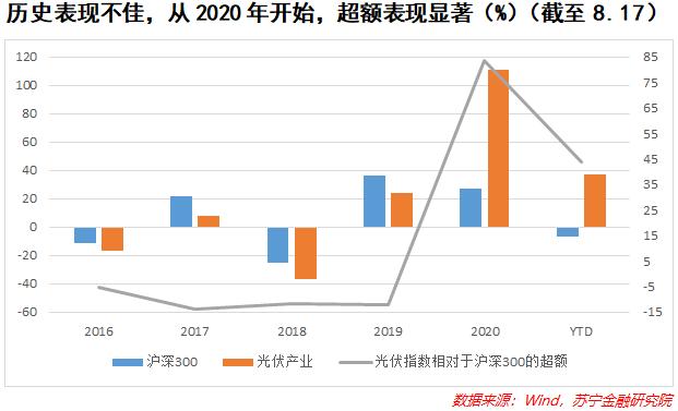 如果分年度来看,则更能够看出差异。在2016-2019年间,光伏指数的表现都要弱于沪深300指数。但从2020年开始,光伏指数开始快速增长。