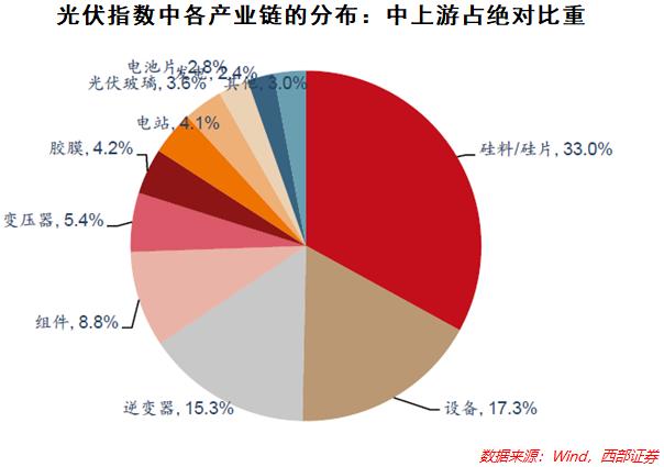从光伏指数成分股在各产业链的分布来看,上游的设备及原材料占据绝对比重,光伏设备占比17.3%原材料端的硅料/硅片占比33%,中游的组件占比8.8%,偏下游的逆变器占比15.3%。