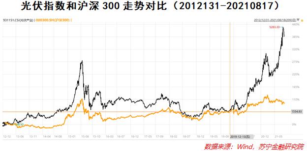 以光伏指数和沪深300的对比来看,光伏指数相对于沪深300指数的累计超额收益在2019年底基本为零。