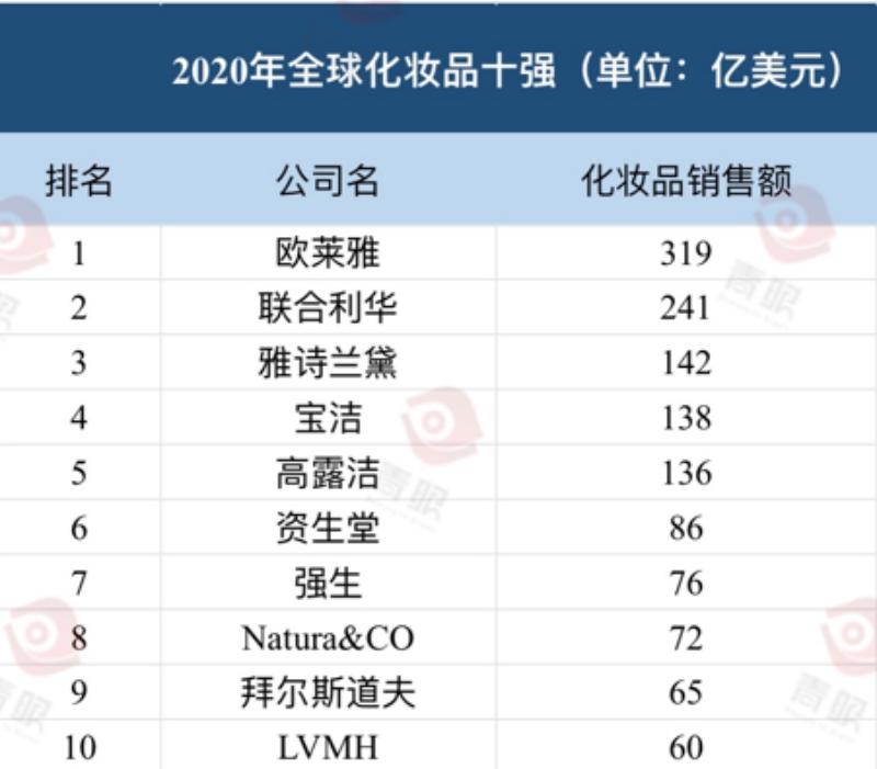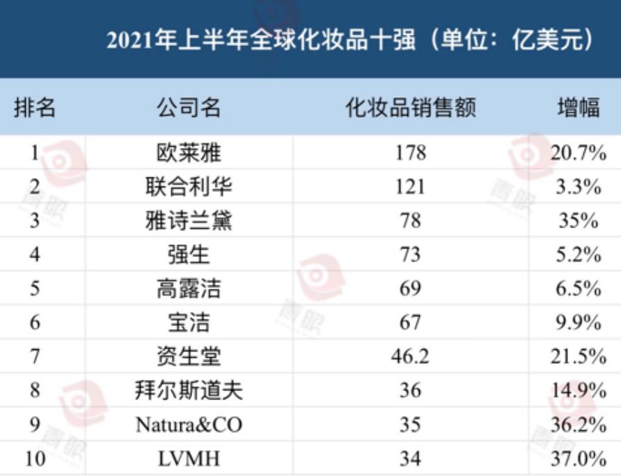 雅诗兰黛集团财报的公布,也揭开了2021年上半年全球十大化妆品企业的“面纱”。