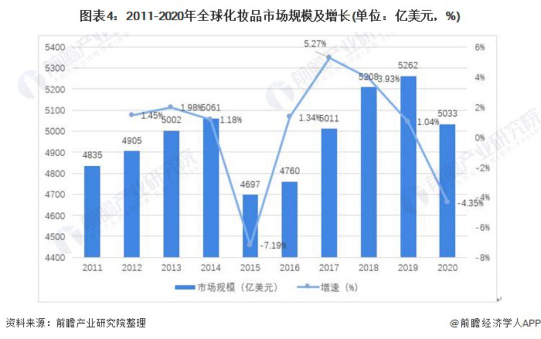 根据Euromonitor数据统计显示,2017年全球化妆品市场规模为5011亿美元;受疫情影响,2020年全球化妆品市场规模较2019年的5262亿美元有所下降,为5033亿美元。