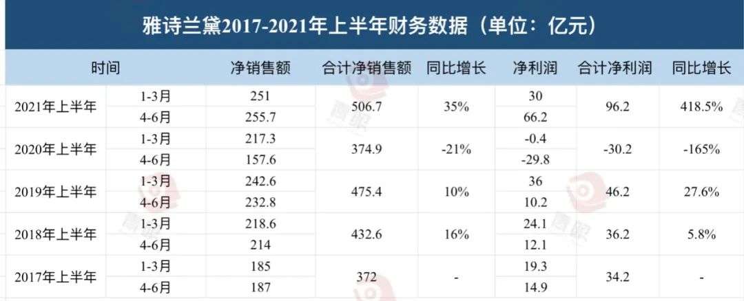 也就是说,算上今年第一季度251亿元的销售额,今年上半年雅诗兰黛集团共卖了506.7亿元,同比2020年上半年增长35%;净利润96.2亿元,相比去年同期30.2亿元的亏损,增长了126.2亿元,增幅高达418.5%。