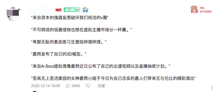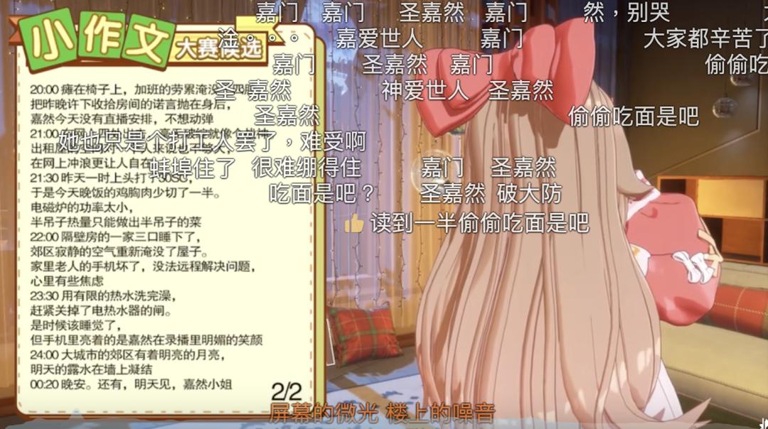 第二次转机同样发生在直播,嘉然按照惯例念粉丝写的小作文,发现这位粉丝是一个人在异乡打工,生活得也不算好。嘉然在刚开始读信时有点哽咽和抽泣,之后,她抑制不住转身去抹眼泪。看直播的粉丝感动不已,很多留言和评论都在说,她 (指嘉然,也指嘉然背后的中之人) 也是打工人罢了,还为之前一直吐槽她而懊悔。从这次念信开始,小胥说,VTuber圈的粉丝在常聚集的贴吧、B站,几乎全员转粉。
