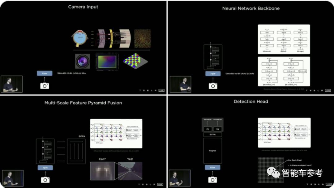 特斯拉车辆上的8个摄像头获取原始输入后,系统会创建各种分辨率的图像,用于各种功能和目的。