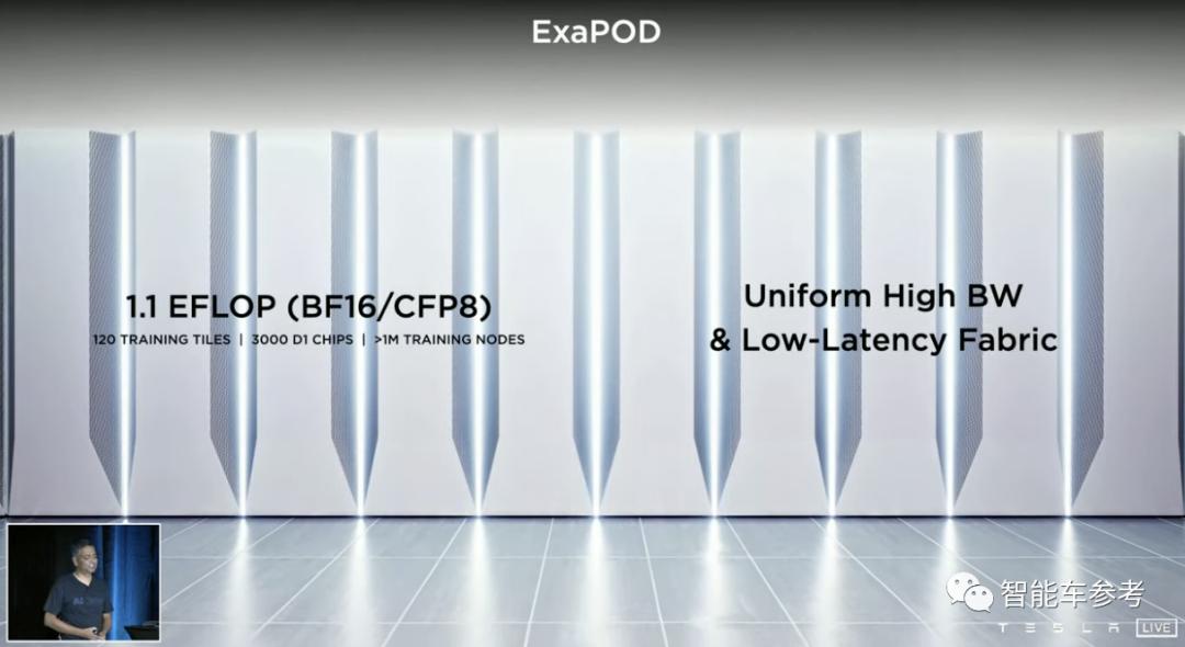 ExaPOD,集成120个训练模块,包含3000个D1芯片,超过1百万个训练节点。算力达到1.1EFLOP。