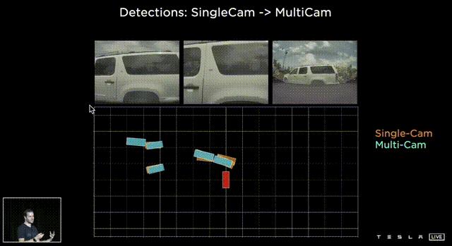 特斯拉方面还比较了多摄像头方案和单摄像头方案的差别,相同的场景下,单摄像头方案识别率明显低于多摄像头方案。