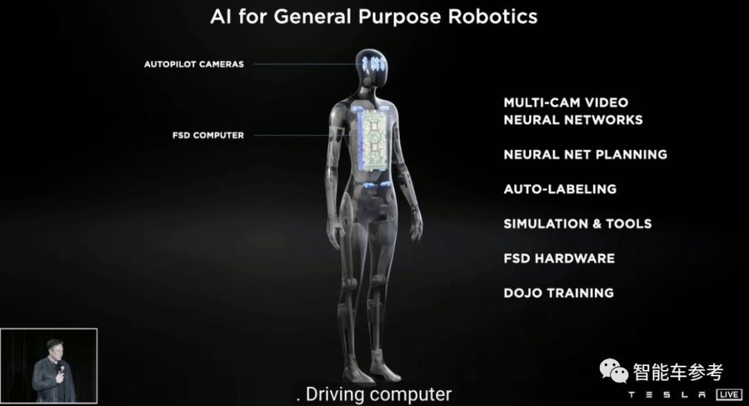 比如使用Autopilot的摄像头充当感知系统,胸腔里内置特斯拉自研芯片——FSD同款,还会加持多项特斯拉已开发出的技术,如多摄像头视频神经网络、规划能力、标记。