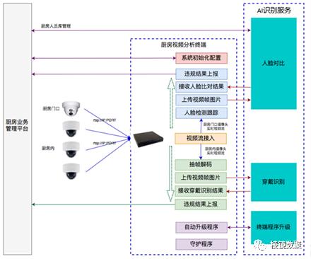 棱镜数聚“智慧厨房安全监督管理系统” 应用AI识别能力可进行人员身份确认,判断是否持证上岗、是否符合佩戴口罩、厨师帽等穿戴规范,并可将接收终端上报的违规信息进行展示。