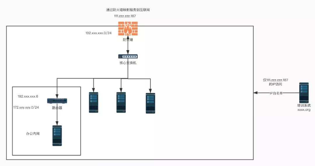 4、解决传统VPN无法解决的问题。例如,传统VPN不支持自定义路由配置。如下图所示,甲方需要在其实验室的办公内网访问部署在公网上的培训系统,但办公内网使用172网段,无法直接通过防火墙开放到外网,需要系统支持路由配置。这种自定义路由配置,在传统VPN上实现难度较大。