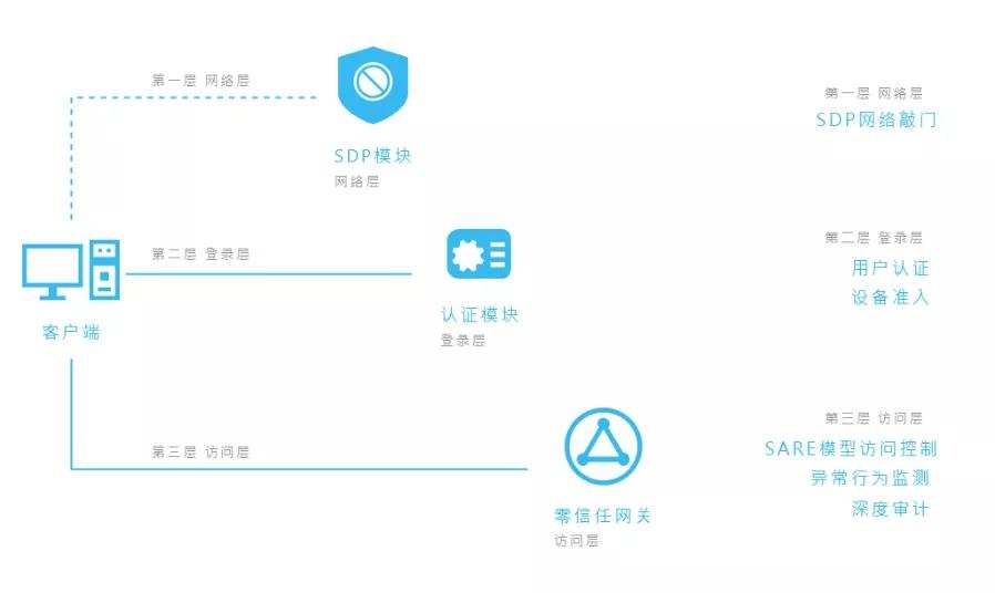 针对远程访问实验室内部服务资源的全业务流程,虎盾ZRA提供基于设备侧环境信息和网络侧行为信息,覆盖网络层、登录层、访问层的一体化零信任防御体系。