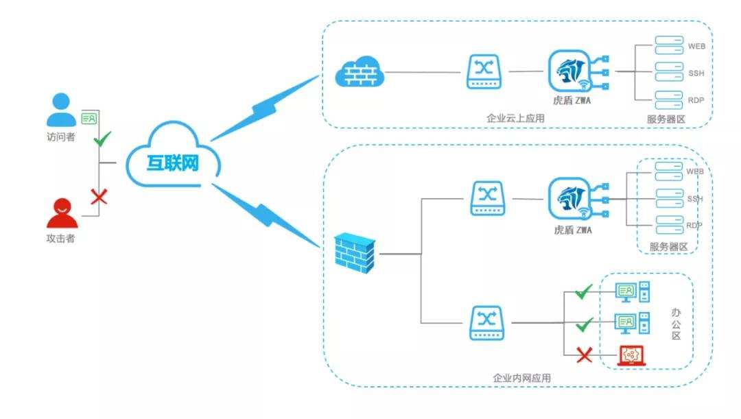 该方案在互联网上针对企业的私有Web应用构建只对内部人员开放的可信身份网络,有效解决企业私有Web应用开放在互联网上所导致的风险暴露面问题;所有流量收口到虎盾ZWA上,既可以集中执行安全控制策略,也可以避免业务系统中的漏洞和风险暴露在攻击者可直接接触到的地方;同时通过对所有访问请求加上身份标签,将网络流量身份化,实现细粒度的访问控制、用户异常行为检测和深度Web数据分析审计,阻止合法用户访问所导致的敏感数据泄露问题。