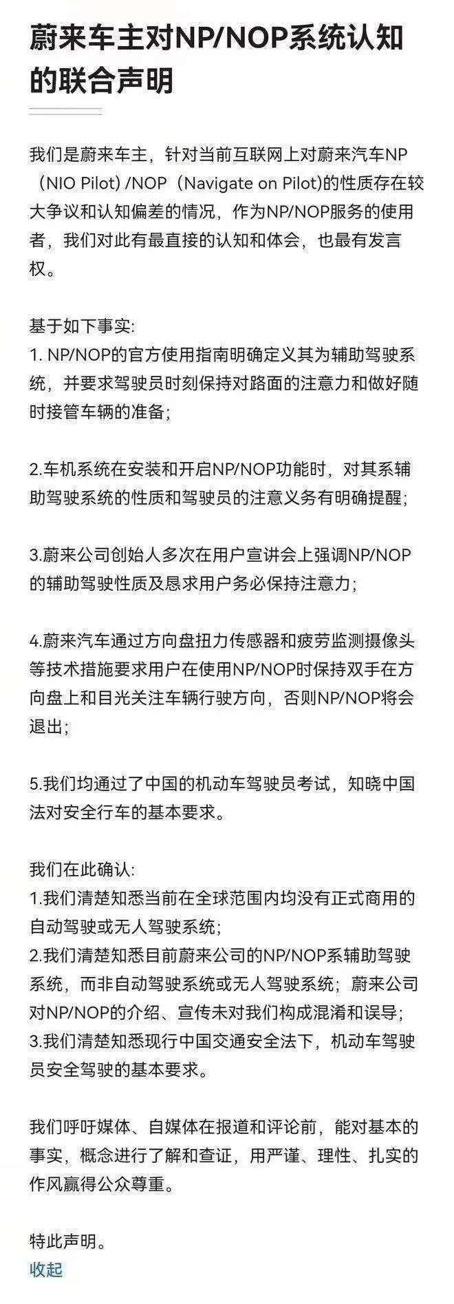 8月18日,网上出现了一则“蔚来车主对NP/NOP系统认知的联合声明”,由蔚来车主林蔚律师牵头,500位车主署名,声明宣称蔚来汽车对于NOP的宣传,未对用户们构成误导。