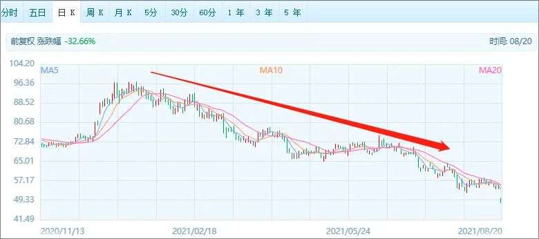 自机构开始出逃,恒瑞医药的股价便跌跌不休,从2021年1月8日的最高点97.23元/股跌至8月20日的49.46元/股,股价腰斩,市值蒸发超过3100亿元。