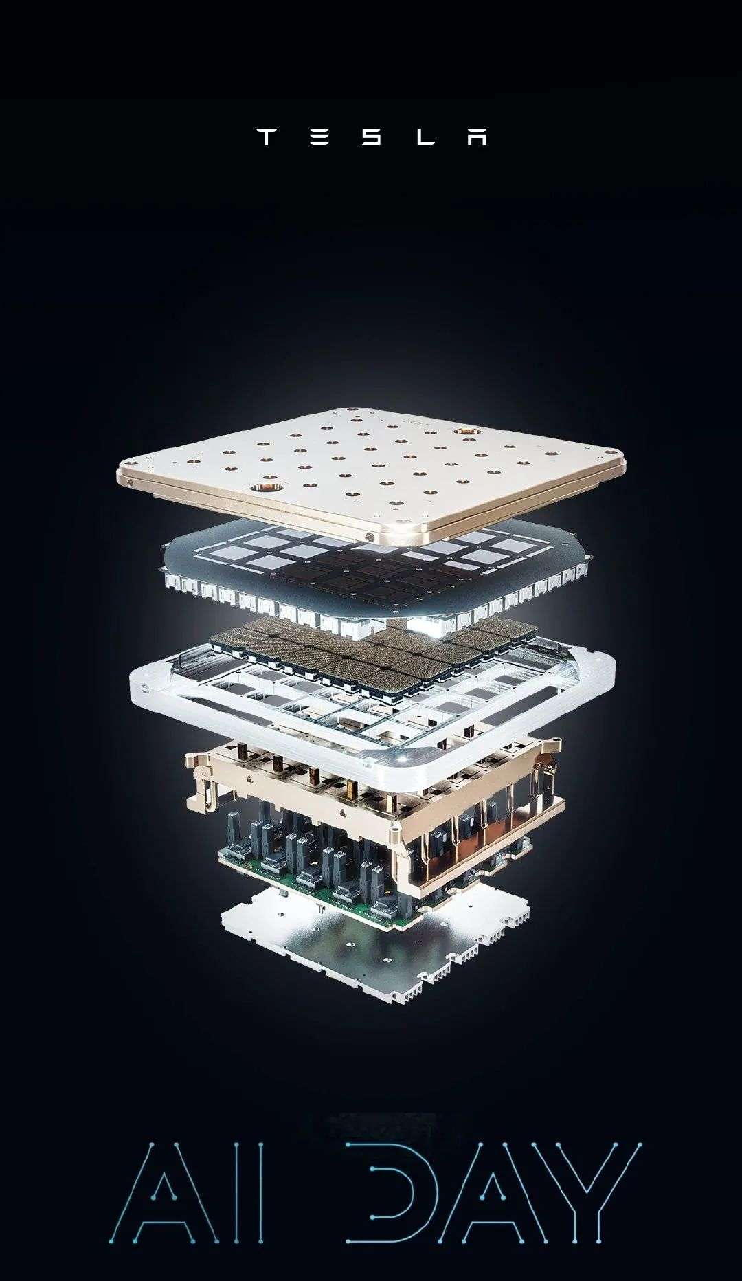 海报上展示了一个大规模芯片模组的结构,包括芯片核心、铜板、散热器、金属外壳等组成元素,人们纷纷猜测这是否与特斯拉 AI 日上将公布的新产品有关。事实证明确实如此。