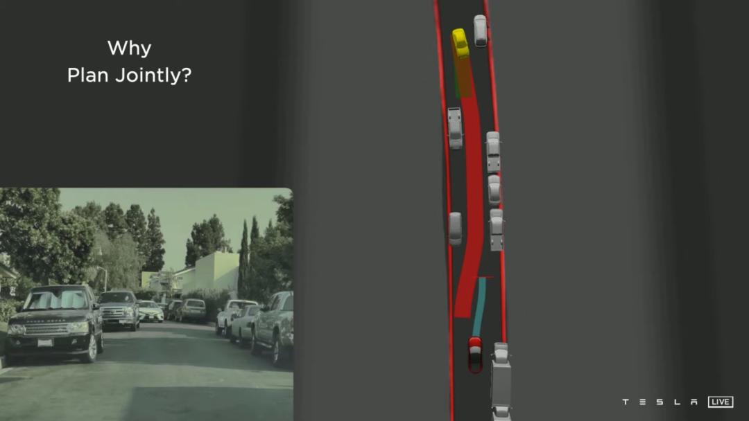 另外,自动驾驶软件总监Ashok EIIuswamy介绍了混合规划系统,以Autopilot为例,当与其他车辆并排行驶时,Autopilot除了要考虑其他车辆的驾驶的方式外,还要考虑它们的运行方式,例如在必要时让行。