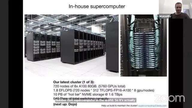 此前,特斯拉高级工程师在CVPR自动驾驶工作坊的演讲中,介绍了特斯拉超级计算机的基本情况。他表示,这台计算机群采用了5760个算力为321 TFLOPS的英伟达A100显卡,组成了720个节点,总算力突破了1.8 EFLOPS,并且拥有10PB的存储空间,读写速度达到了1.6 Tbps。