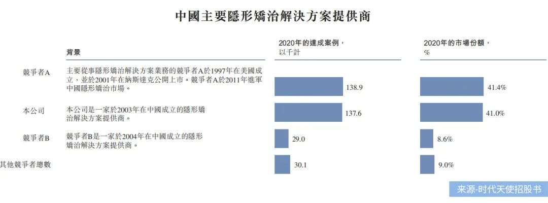 目前,国内隐形矫治市场形成了“双寡头”局面:2020年,时代天使和隐适美市占率分别为41%和41.4%,隐适美反超时代天使,行业竞争加剧。