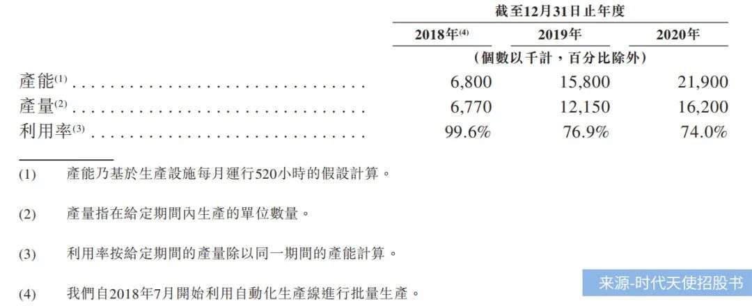 除了销售端的隐忧,在生产端「不二研究」发现,时代天使2018-2020年产能利用率分别为99.6%,76.9%,74%,产能利用率呈不断下降趋势。