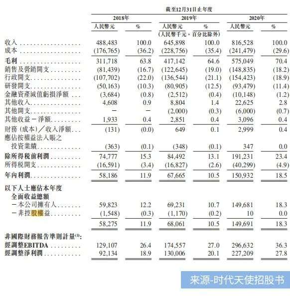 据时代天使招股书显示,2019-2020年时代天使营收分别为6.46亿元,8.17亿元;分别同比增长32.38%,26.36%。2019-2020经调整的净利润则分别为1.3亿元以及2.27亿元;同比增速为44.44%,74.62%。