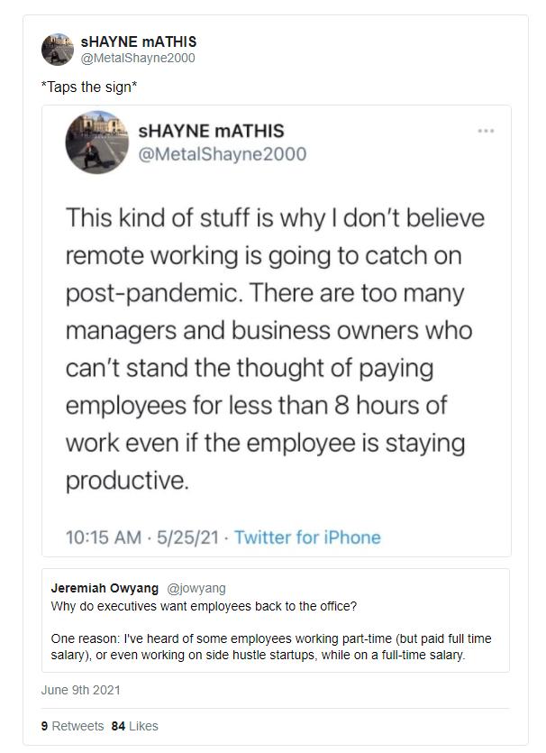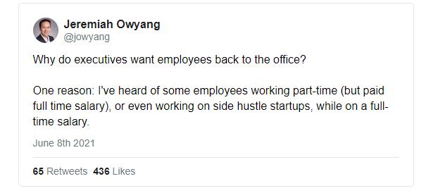 让我们把这种焦虑分拆来看,高管们全职雇佣了一些人,在这种情况下,我假设他们需要做的工作是在兼职时间内完成的。这些人要么是 “兼职工作”,要么是 “做副业”,老板们希望他们回到办公室,表面上是为了杜绝这种做法。远程工作本质上扰乱了员工和老板的权力关系,它将使很多很多人无法适应。原因不仅仅是关于控制,而是就业或合同工作的设计方式的结构,以及我们看待工作的方式。