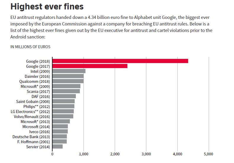 欧洲因为没有自家的互联网巨头,在保护规则制定上毫不留情,天价罚单动辄数十亿欧元。谷歌累计被罚80亿欧元,亚马逊正在一个可能被罚200亿的反垄断调查中。