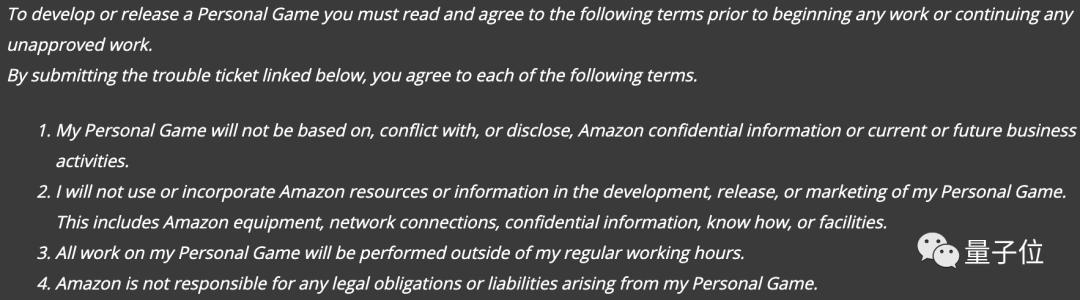 我的个人游戏不能与公司业务冲突、不能利用公司的机密信息、不能使用公司提供的资源、不能占用工作时间,以及亚马逊不对个人游戏承担法律责任。