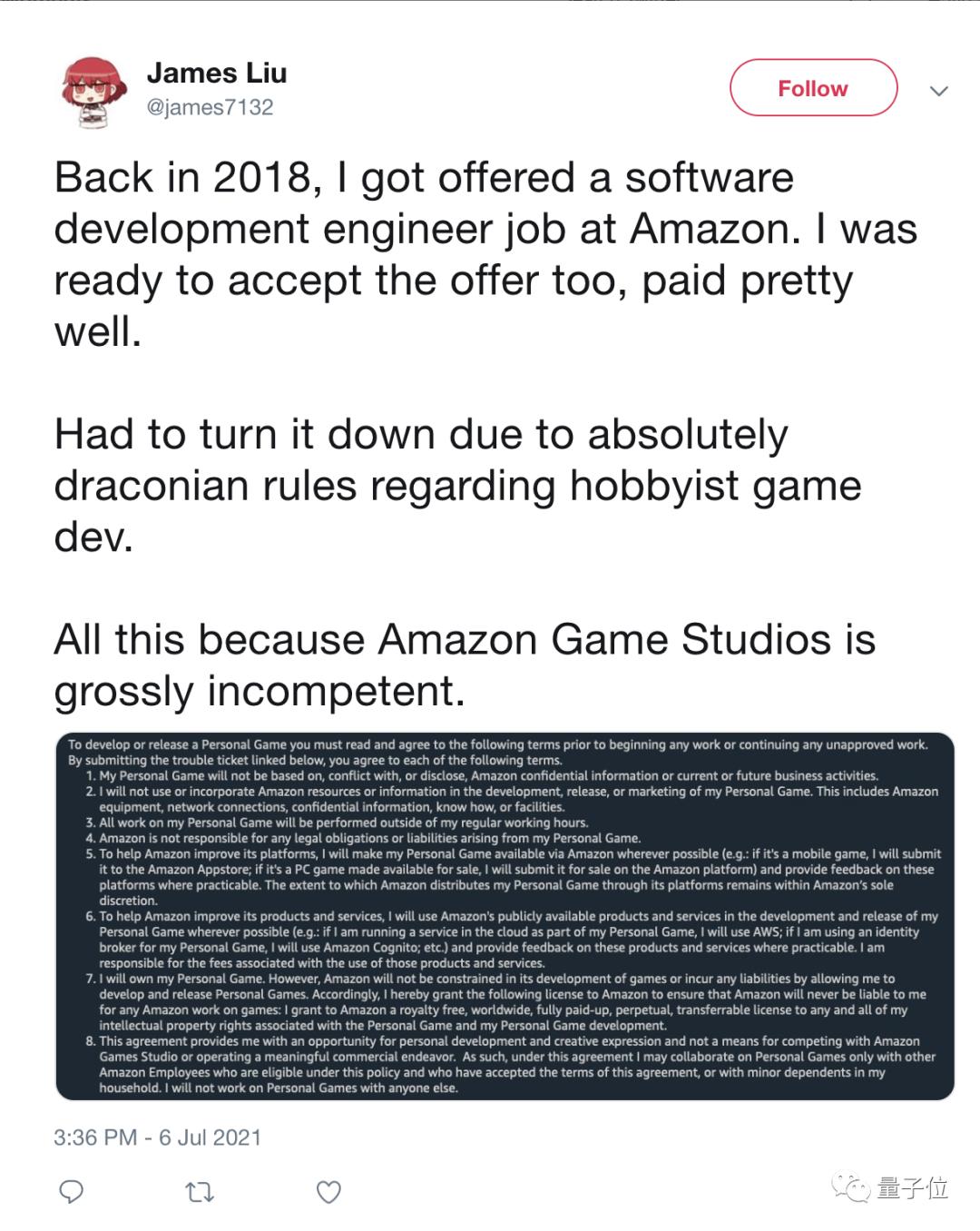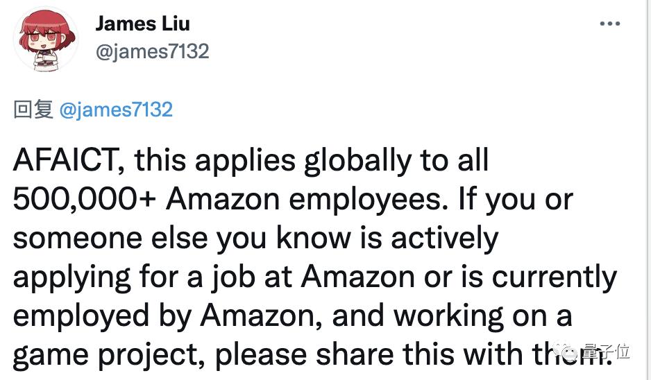 James Liu表示,据他所知这份协议适用于亚马逊在全球的50多万员工,并呼吁如果你认识任何想应聘亚马逊的独立游戏开发者,最好把这个消息告诉他们。