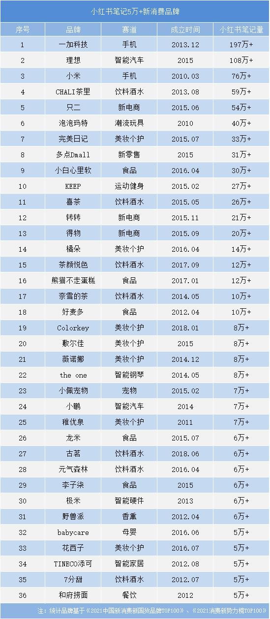 因此,以年轻女性为受众群体的新消费品牌更愿意将小红书作为品牌推广投放平台。盒饭财经结合《2021中国新消费新国货品牌TOP100》《2021消费新势力榜TOP100》整理了小红书上笔记在5W+的新锐品牌,其中包括潮流玩具头部品牌泡泡玛特、新晋美妆国货品牌完美日记、长沙限定网红茶饮茶颜悦色等。