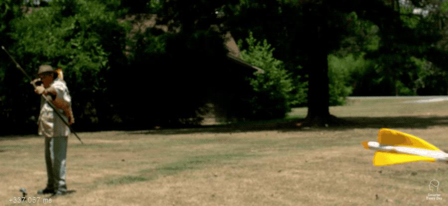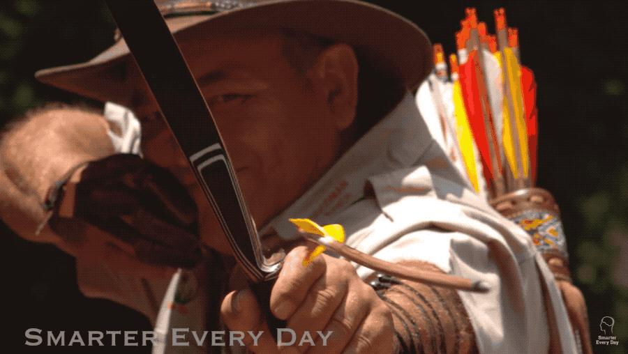 小哥通过慢镜头回放箭的飞行过程发现,这箭它咋不是笔直射出去的呢?