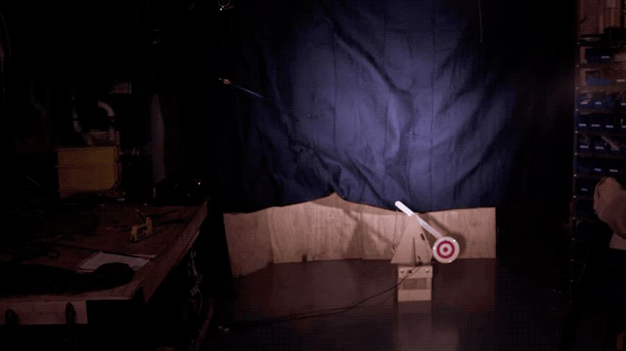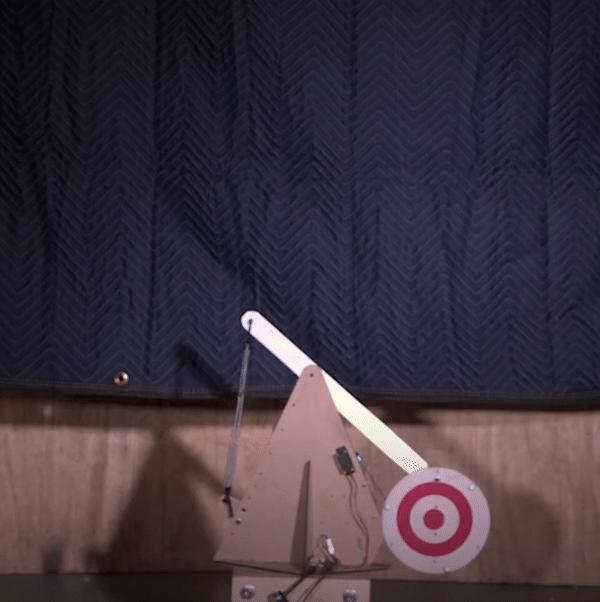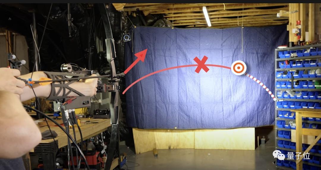 系统每300毫秒检查一下靶子运动的抛物线轨迹传给计算机,然后通过一个“乏味”的小计算来确定弓的移动位置,同时考虑到箭头到达目标的时间以及箭的弯曲路径。