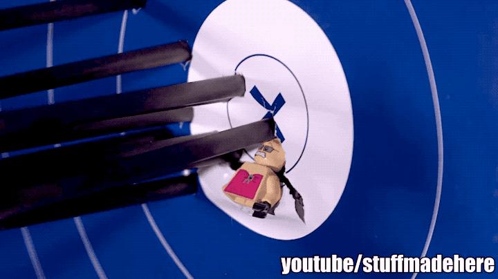 不得不说,小哥花了6周还真做出来了,最终这把弓箭就像狗见了肉猫见了耗子兔子见了萝卜直奔目标。