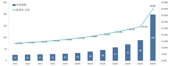 到2030年时,结直肠癌筛查市场规模预计可达到198亿,同时渗透率将提升至约40%,且2019~2030年间的CAGR高达18.7%。