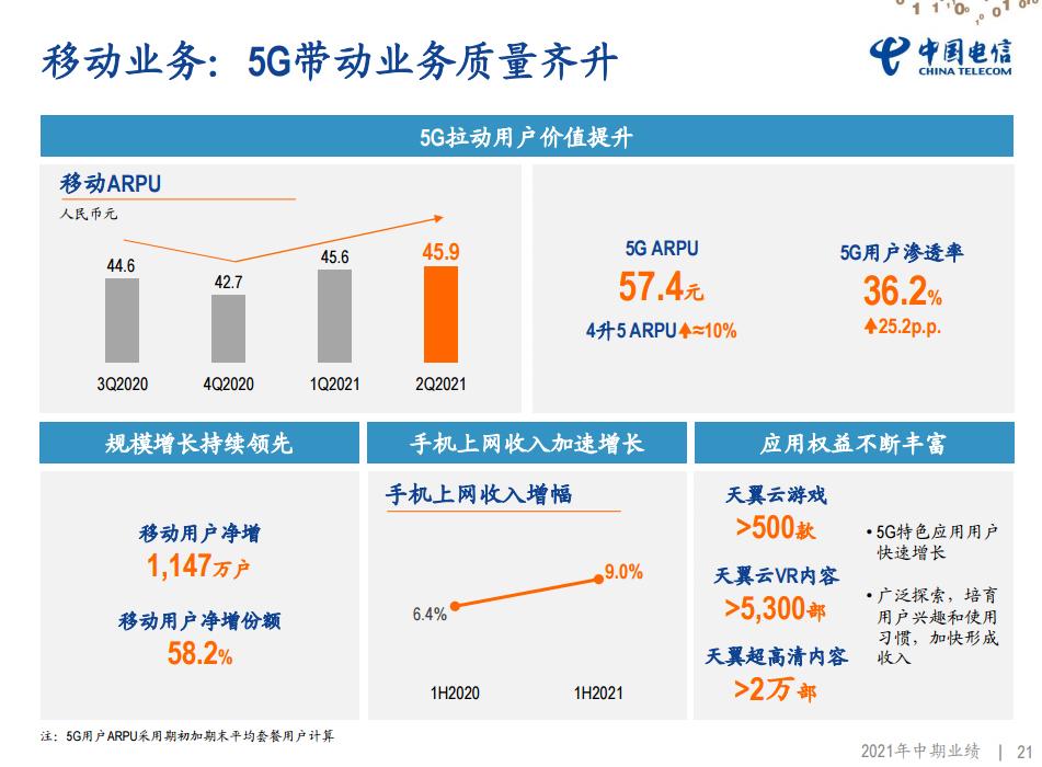 数据显示,截至2021年6月底,中国移动的移动客户达到9.46亿户,其中5G套餐客户达到2.51亿户,渗透率达到26.5%;移动ARPU为52.2元,同比增长3.8%,扭转了自2018年以来的下滑趋势。中国移动披露,其5G ARPU为88.9元,4G转5G客户ARPU直接提升了10.0%。