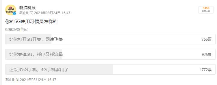 但在这份新浪科技的调查中,截止8月18日晚间有3453名网友参与,其中有1772名网友表示还没有购买5G手机,仍旧在用4G手机,占比高达51.3%。
