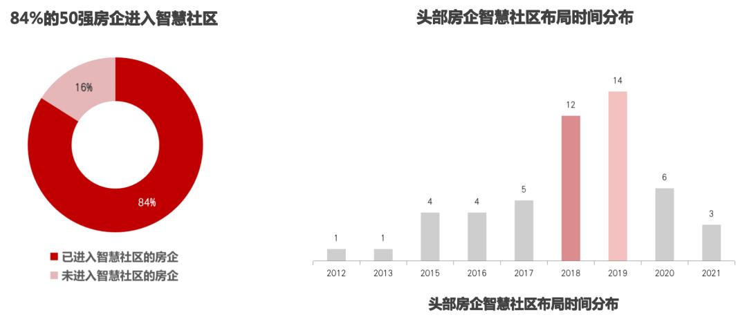经过十多年发展,目前智慧社区市场仍旧保持着较高的增长,从头部企业在智慧社区的参与度来看,84%的50强房企均已涉足智慧社区领域。一方面,用户对智慧社区服务的需求度不断提高,推动房企物企提高社区服务建设标准,另一方面更重要的是,依托于国家政策“红利”。从数据上看,2016-2018年恰逢国家集中发布智慧社区相关政策的时间段,因此2017-2018年也成为头部房企集中布局智慧社区的时间点。