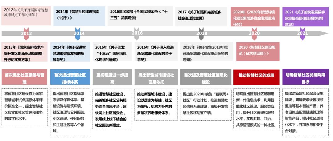 自2012年起,国家多部委就智慧城市的发展提出了多项政策文件,其中,智慧社区作为智慧城市建设中的关键节点也被多次提及。无论是从政策发布的频率,还是相关细则中对于智慧社区建设目标的不断明确来看,整体政策上都呈现一种向上利好的态势。