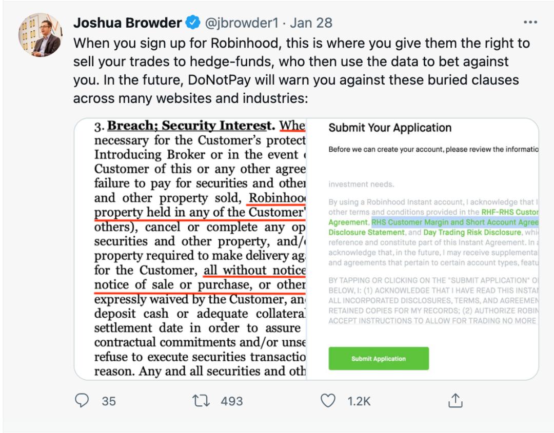 今年年初,在由散户推动的美股交易热潮中,Robinhood以市场波动等因素为由宣布停止GameStop和AMC Entertainment等“meme 股票”的交易,引发了用户的大型愤怒,许多用户当下就直接跑到DoNotPay的Twitter账户留言求帮助。