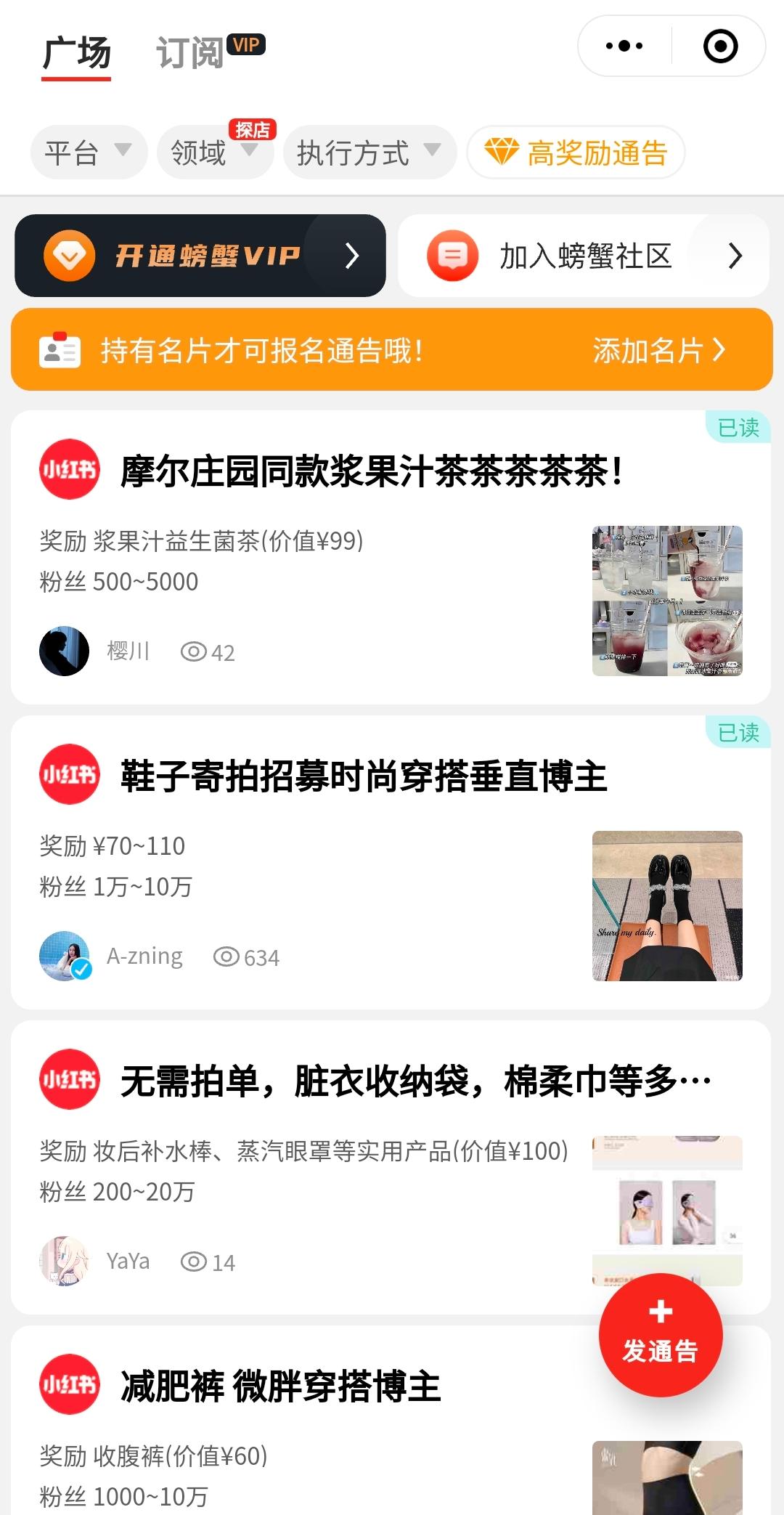 平台包括小红书、抖音、微博、Bilibili、快手。即达人可选择商家所发布的其中一个平台商业推广通告。值得注意的是,在默认的情况下,首页推荐通告均为小红书。